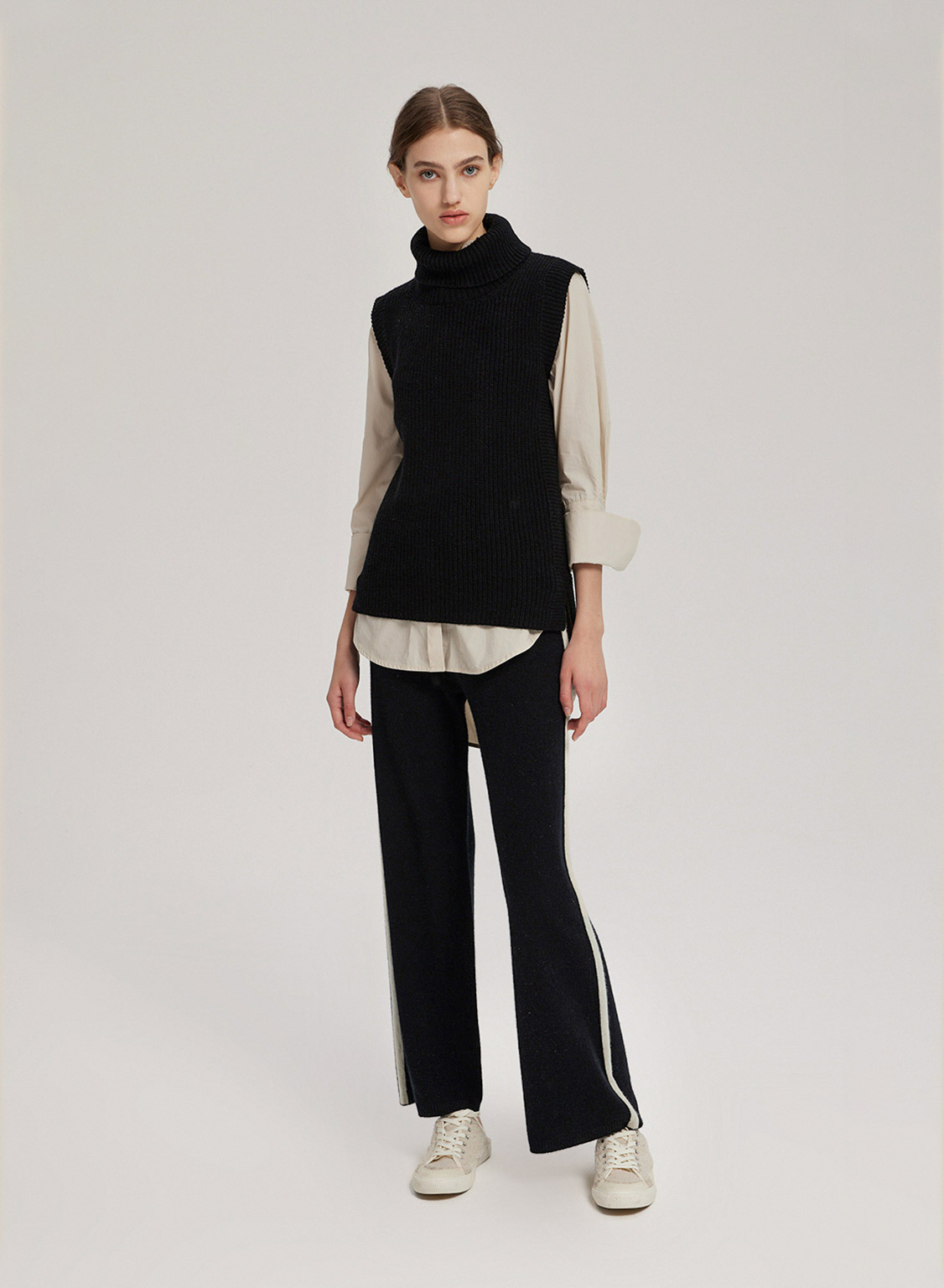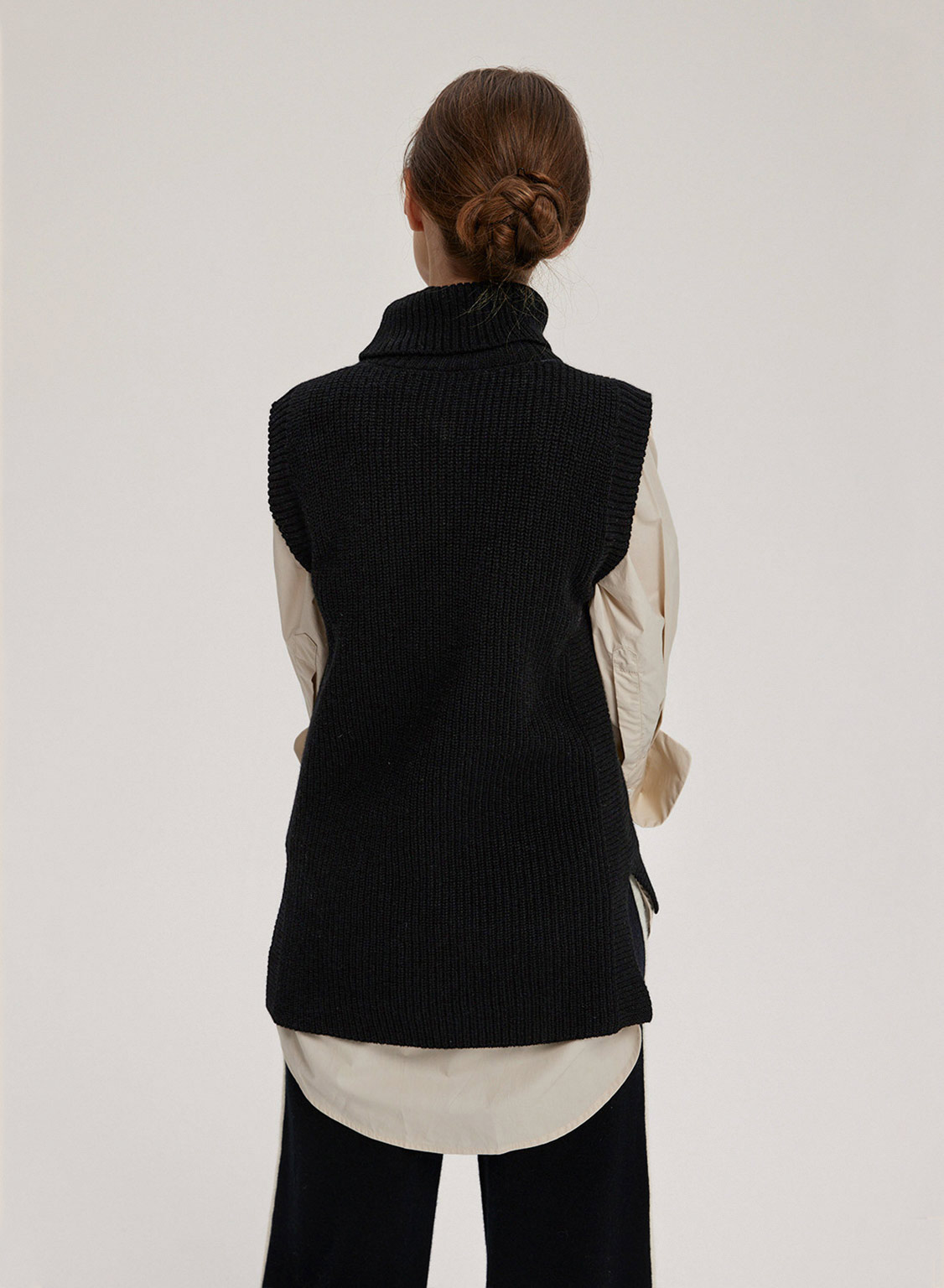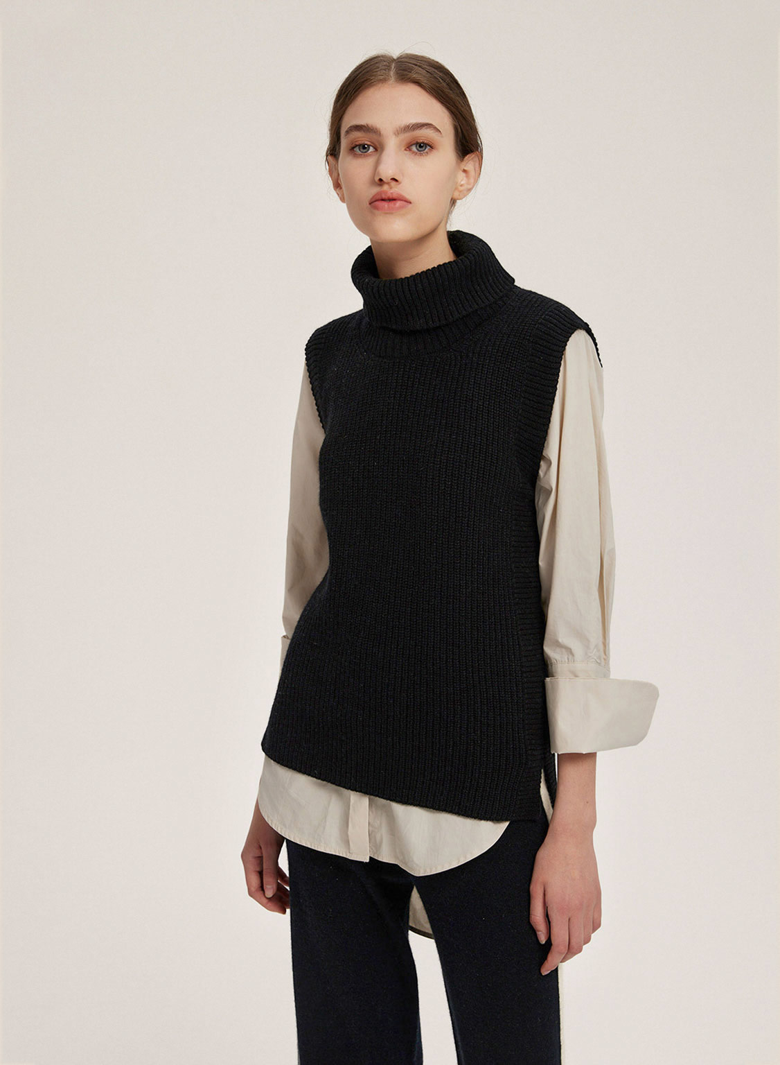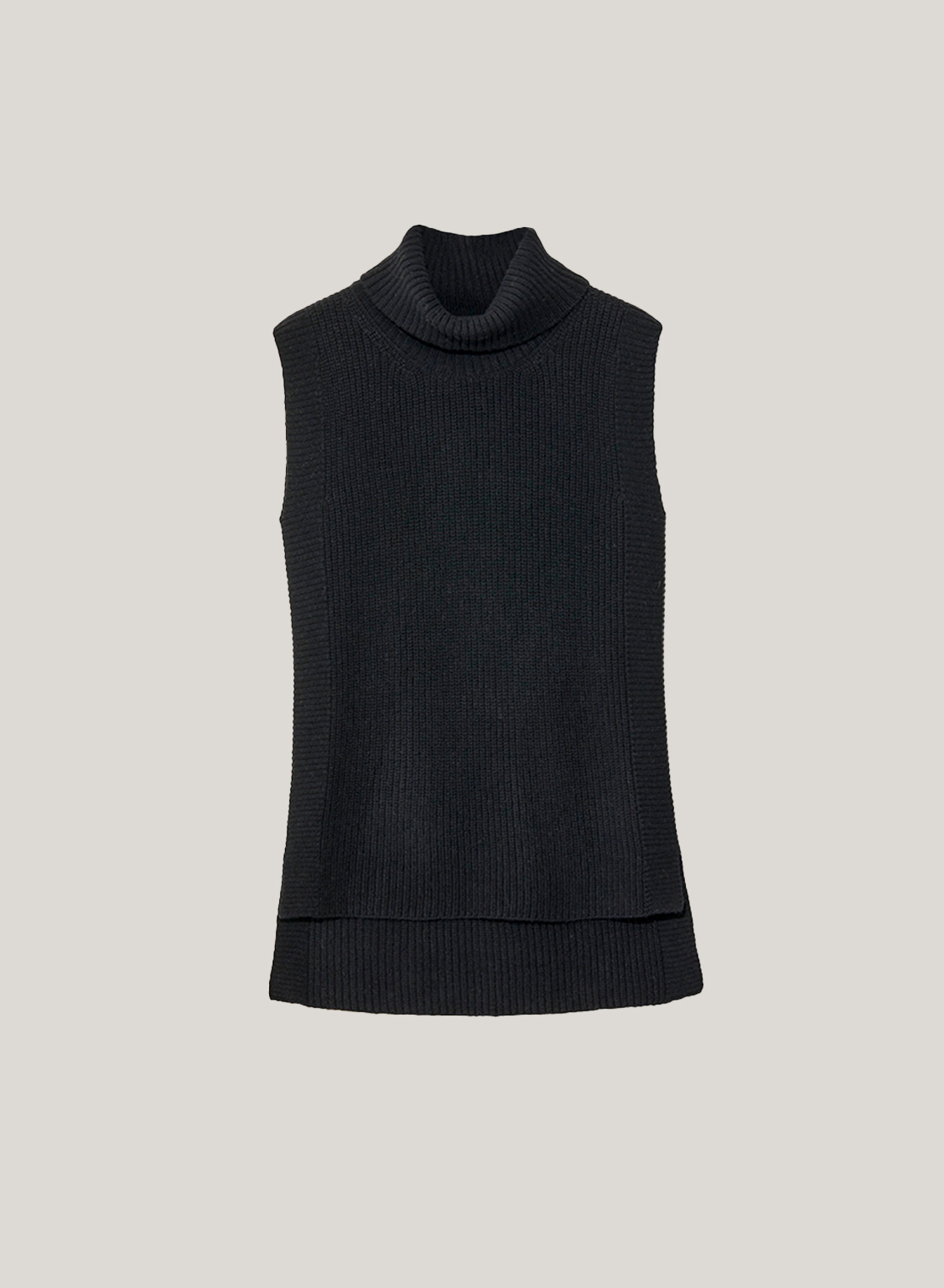 A soft knit perfect for layering. With a slouchy high neck and loose fit, this sleeveless design matches comfortability with style.