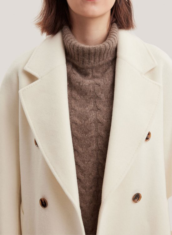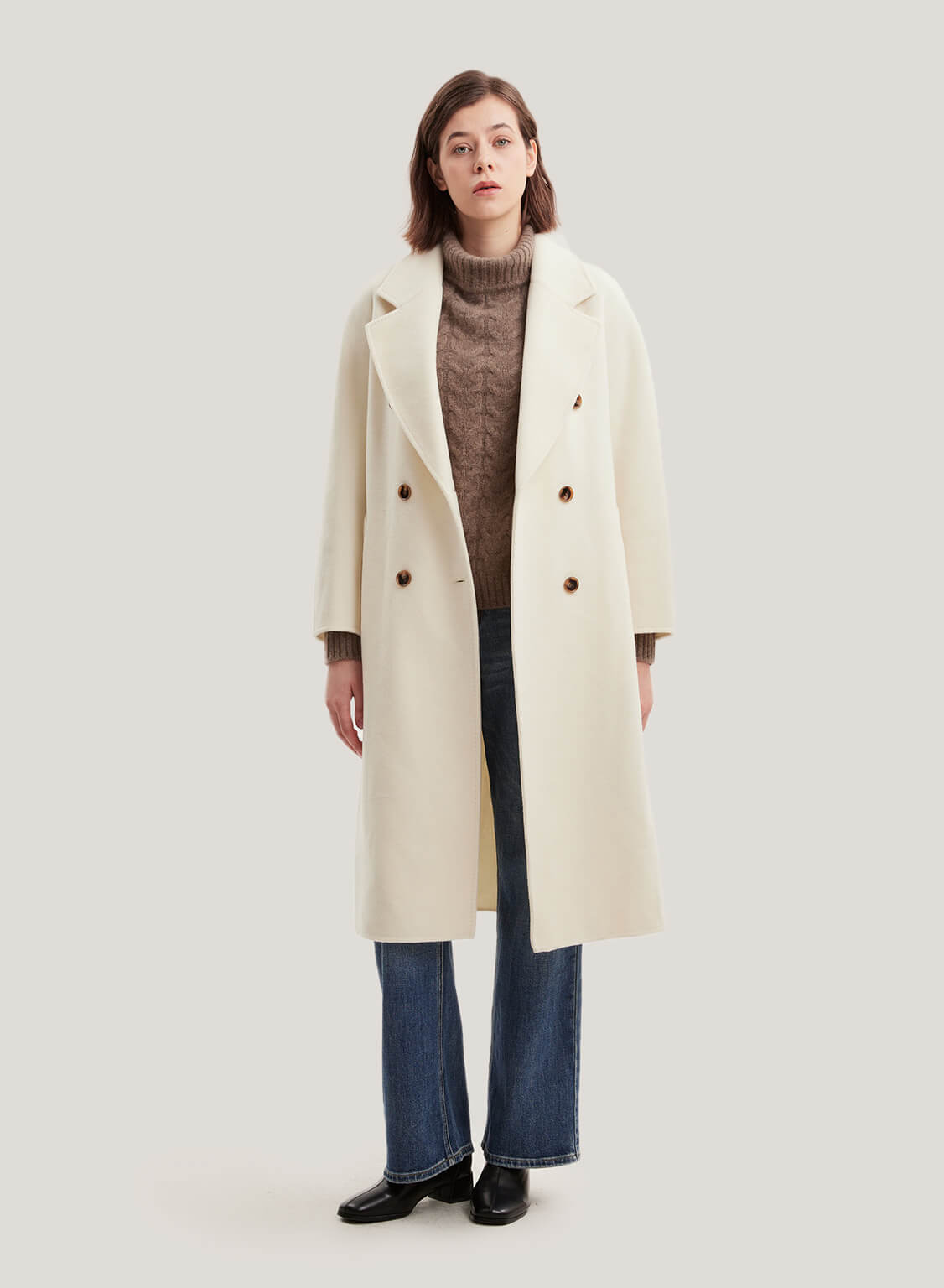 This style is cut in pure wool and detailed with an oversized silhouette, long sleeves, notched lapels, double-breasted, two sides slit pockets. A classic elevated piece while preserving the usefulness of stylish.