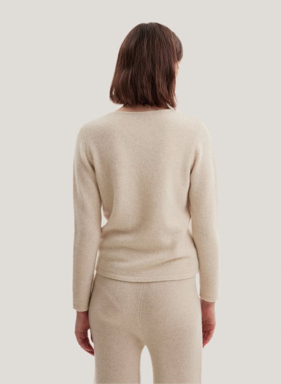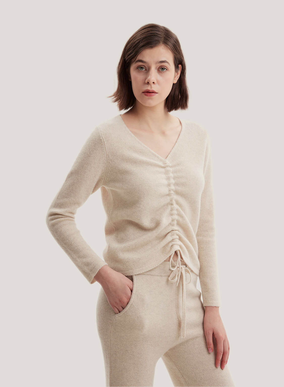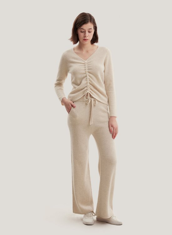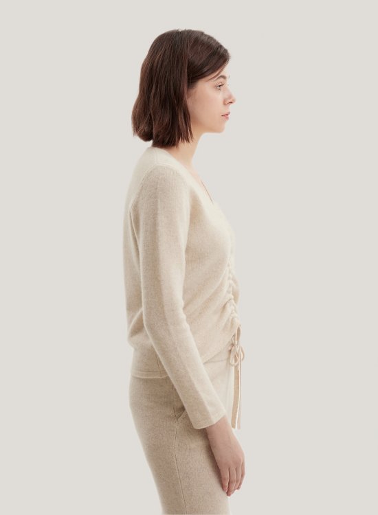 Highlight a relaxed, comfortable look with the softest blend of wool and yak in a slim silhouette. Featuring a drawstring front as a surprise finish and has a wide V-neckline of this feminine top.- Normal Fit