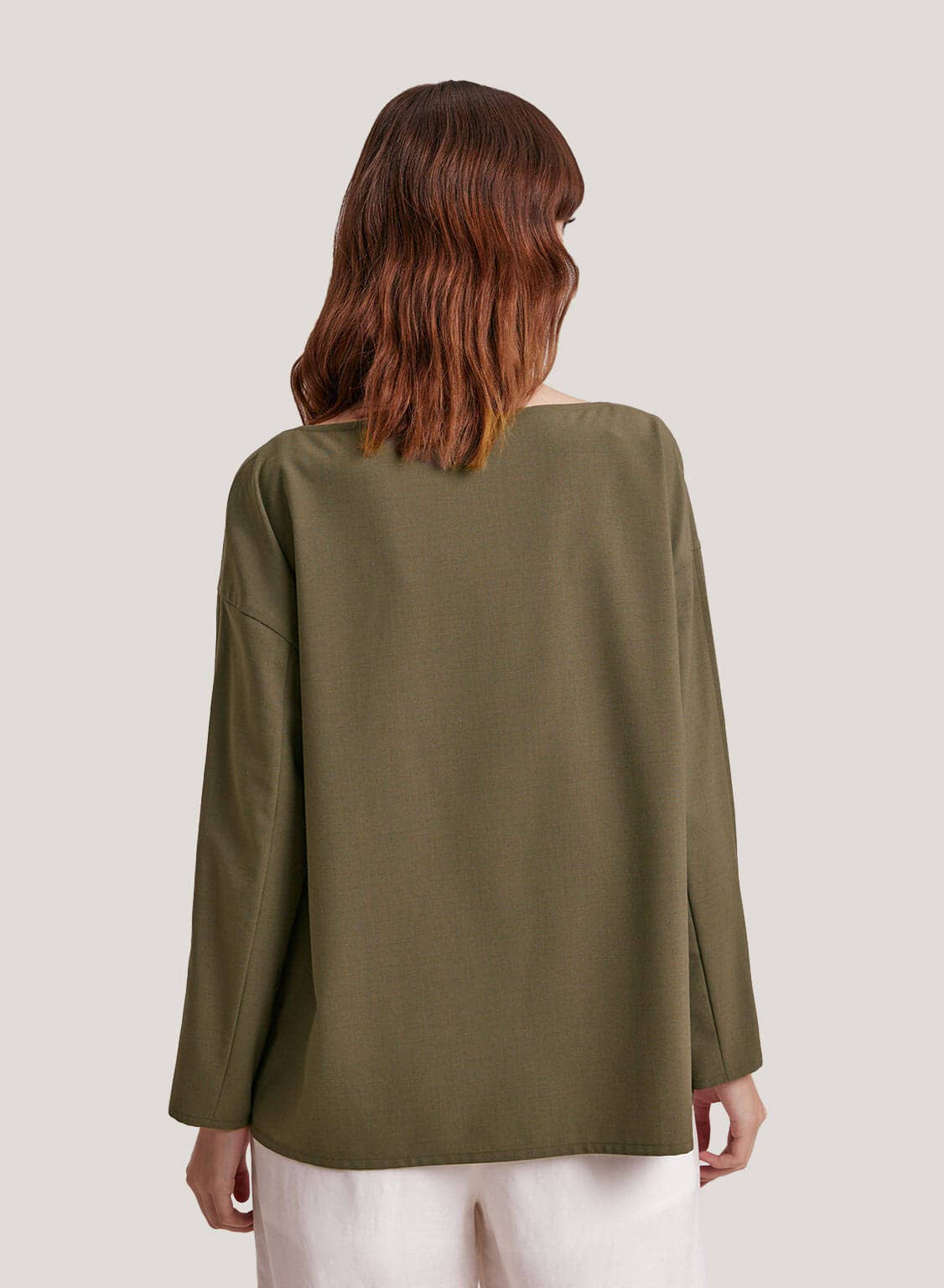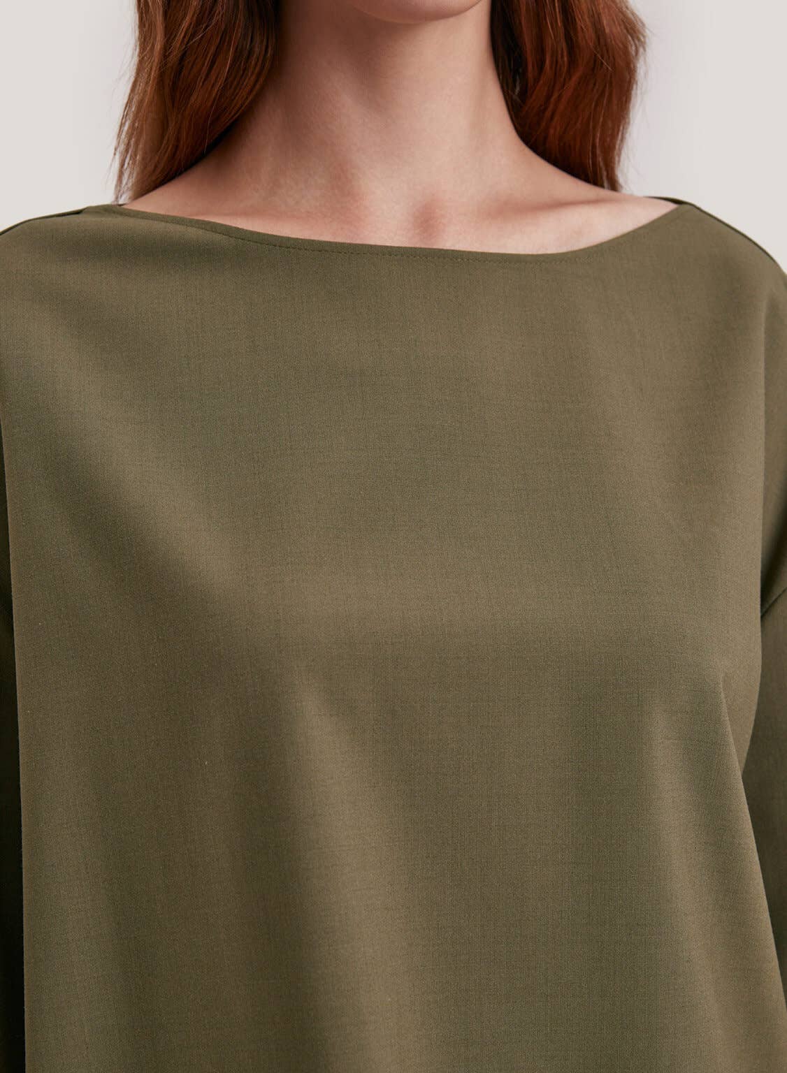 Made in the fluid wool blend, this blouse with a boat neck has a draped silhouette that flutters as you walk.