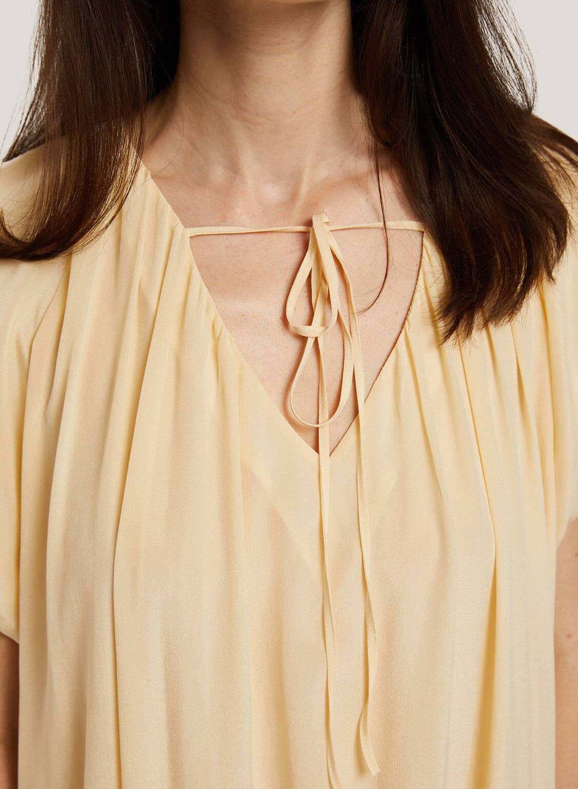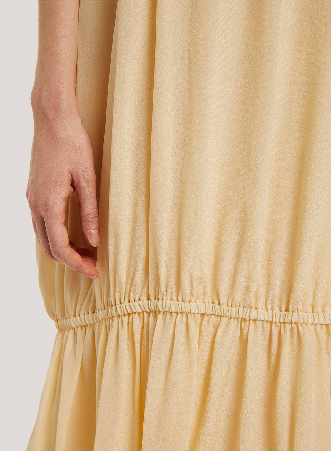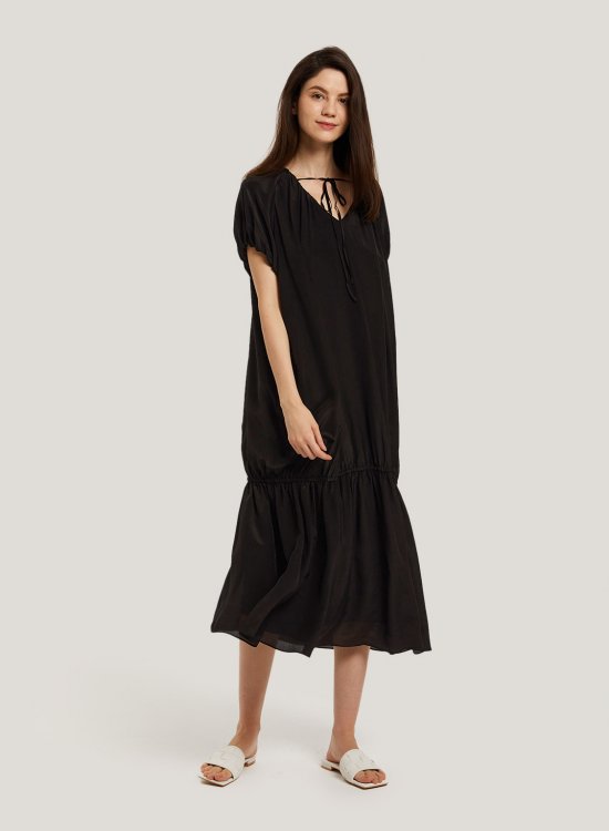A dress that makes you smile. Featuring cinched sleeves, dropped waistline, and midi length, this dress is a comfortable way to look stylish.