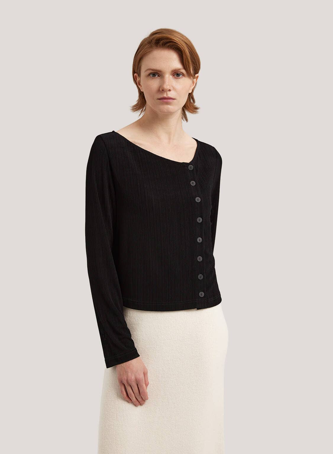A boost to the regular, classic Top. Featuring an asymmetrical design with side buttons and slanted neckline, this Top is for the fashionistas.