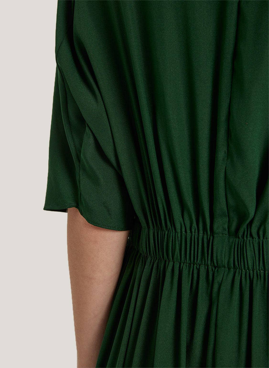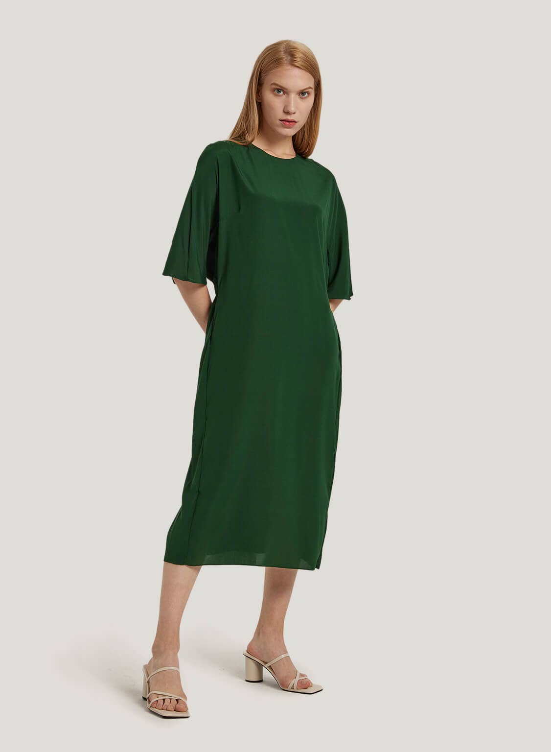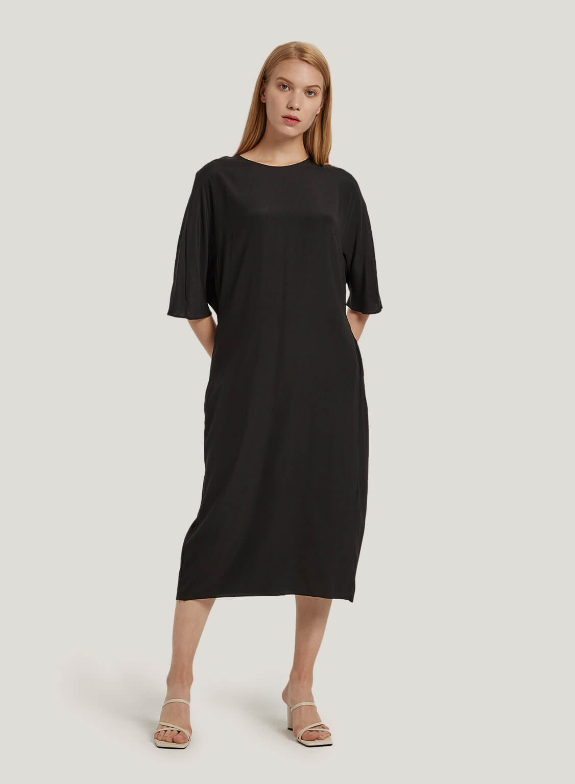 This effortless maxi dress lightweight fabric has an oversize silhouette and a very chic with a cool touch. It also features a shape in a slouchy and emphasized by a sweeping dress hem.
