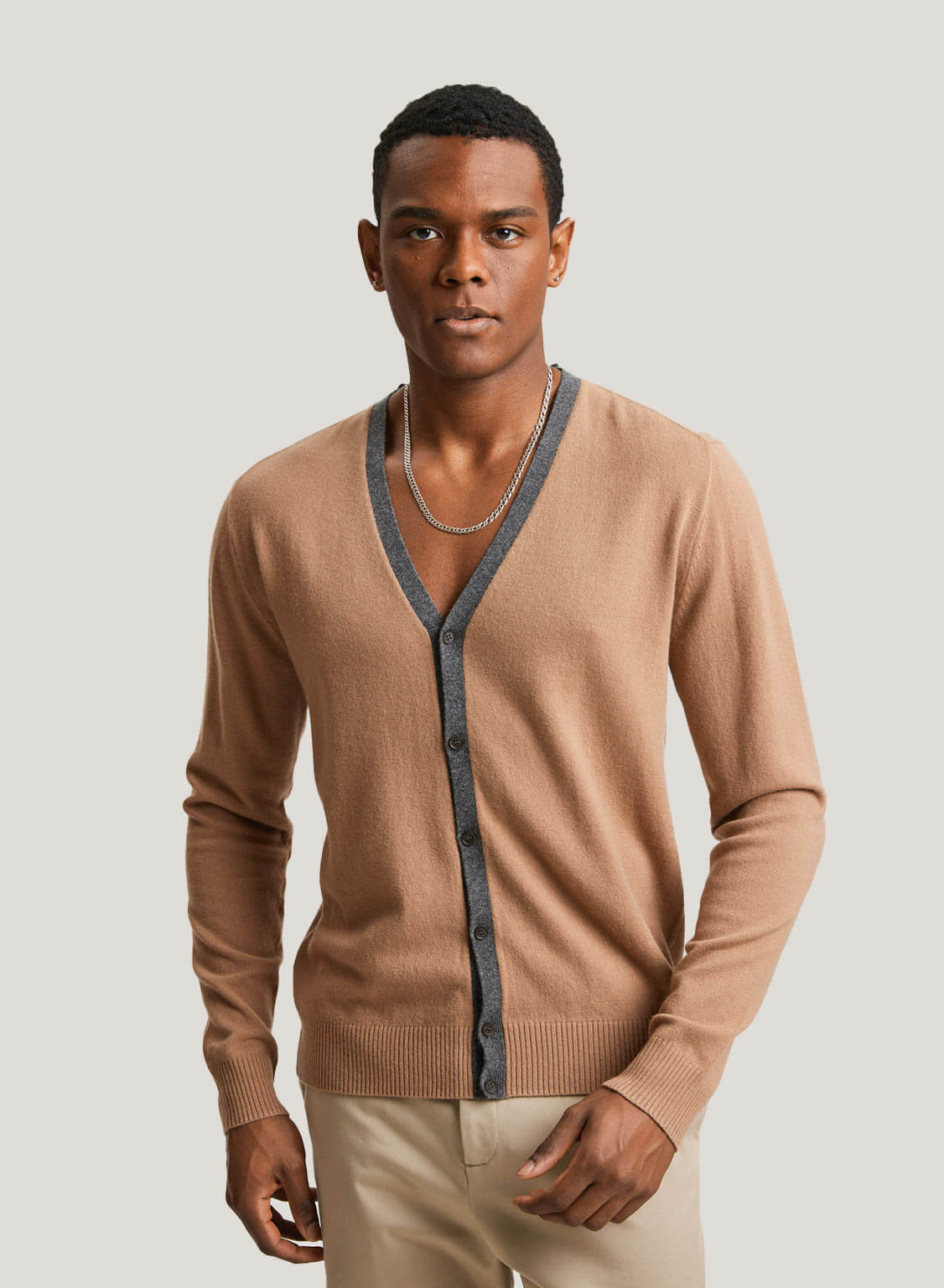 A great transitional piece. Featuring v-neckline, colored elbow pads, and a two-tone design, this cardigan looks terrific with a pair of khakis.