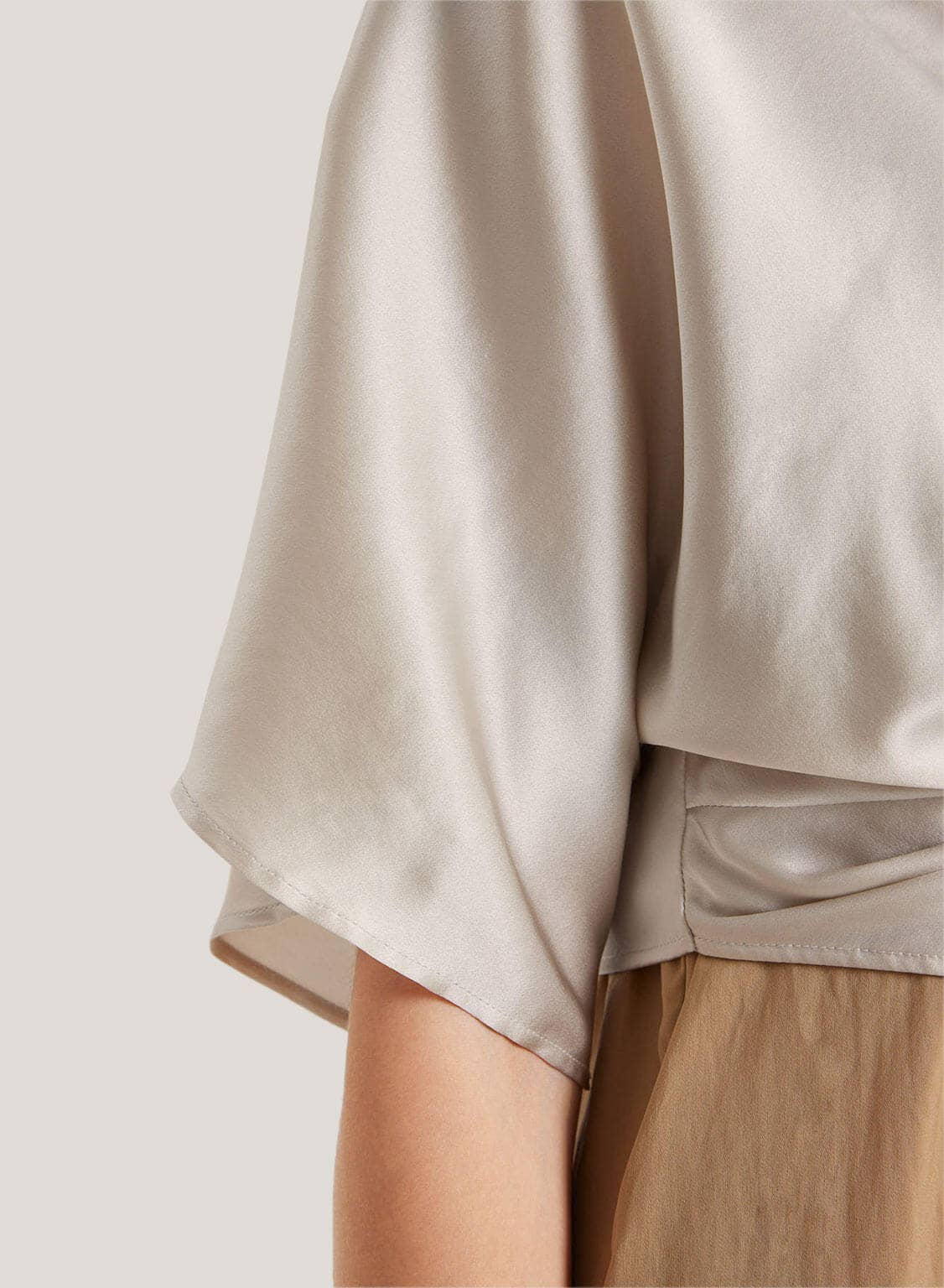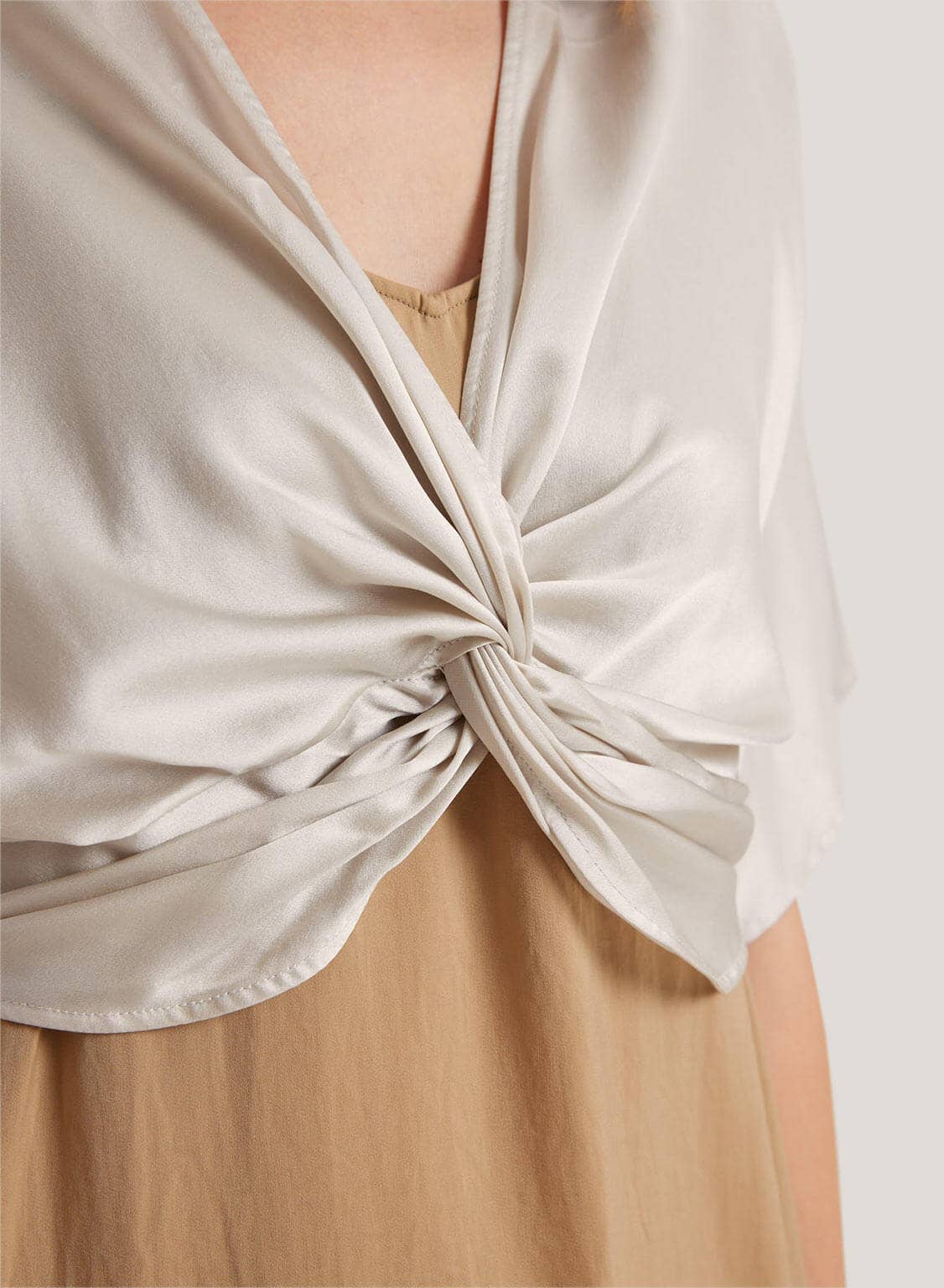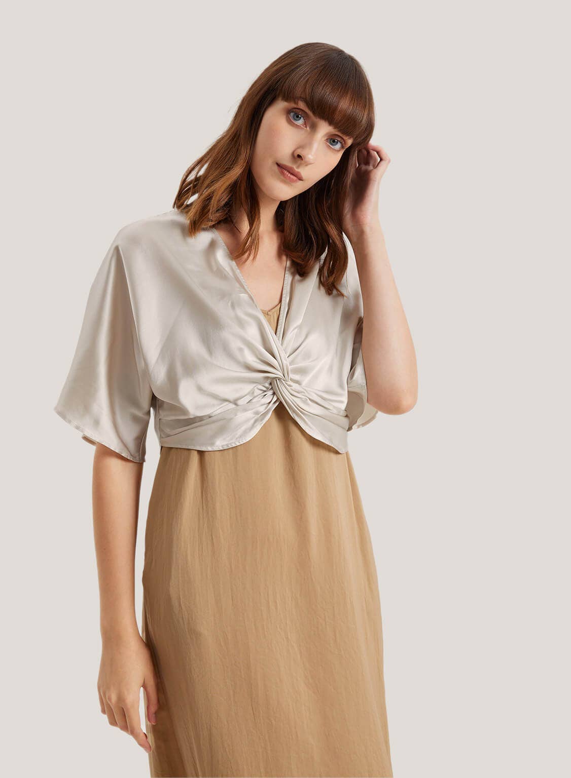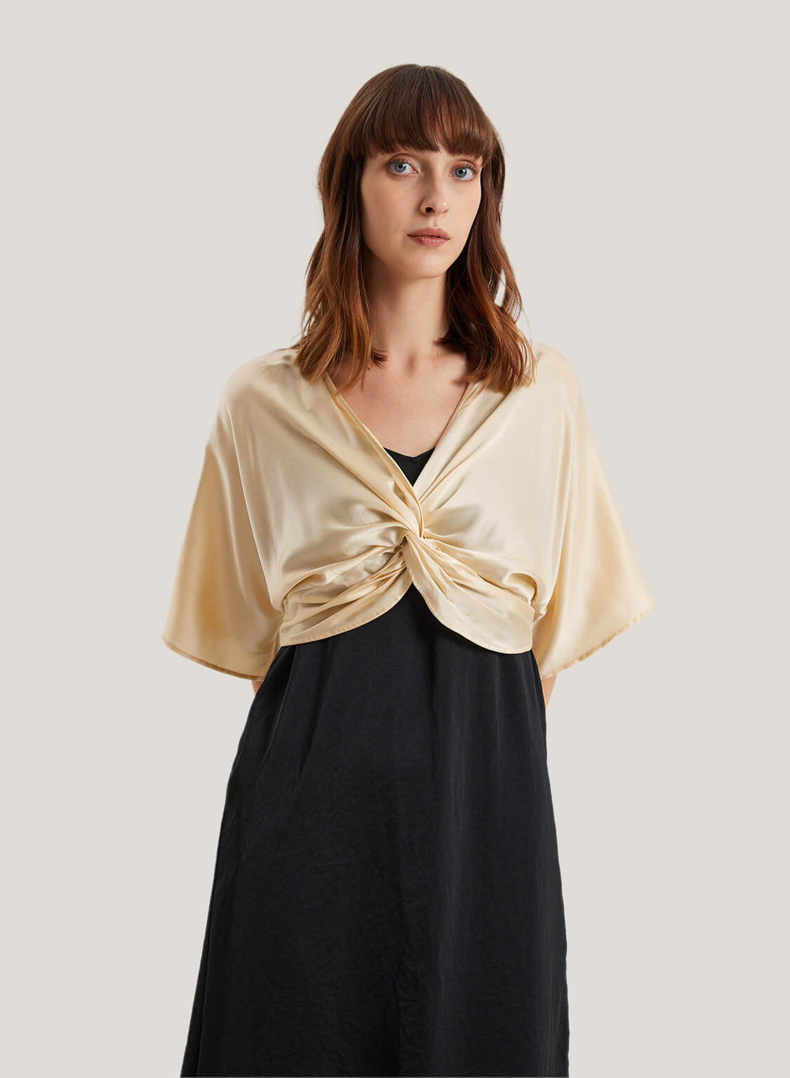 This top with a fairytale-inspired aesthetic. This pure silk cropped top draped into a drape V-neck silhouette with flounced sleeves, and a wrapped front is perfect for sultry days.