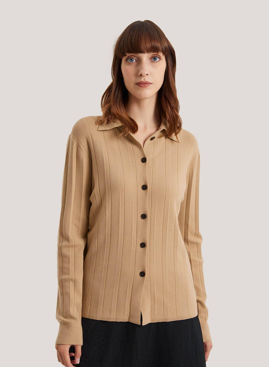 This cardigan knitted in pure merino wool for a boxy silhouette with a classic shirt collar. This cardigan fits perfectly, matching with any tank or tee.