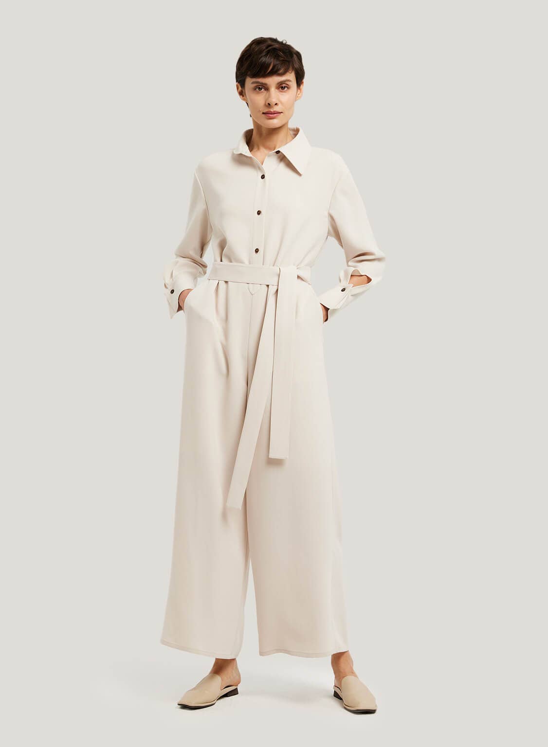 A jumpsuit that dresses to impress. Featuring a button-down front and belted waist, this is an easy option for an all-together chic look.