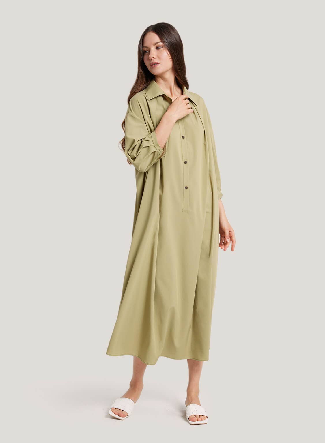 This shirt dress made with a light and breathable fabric for the hottest days of the season. This long sleeve maxi dress is featuring a shirt collar and mid-length sleeves.