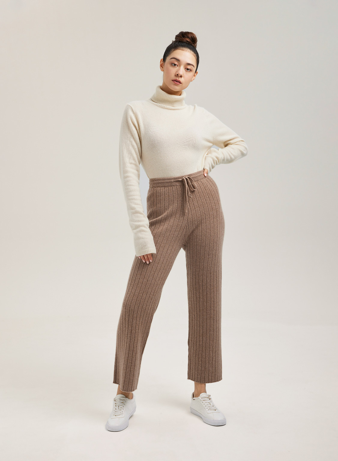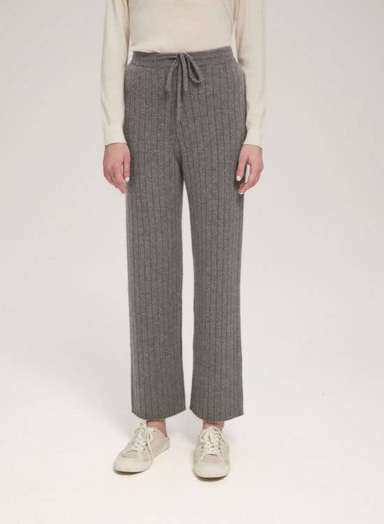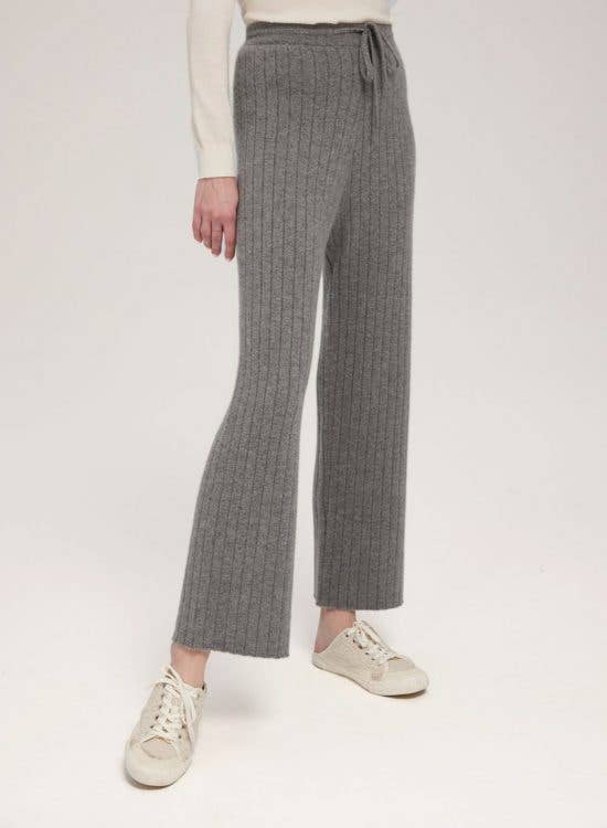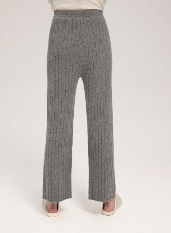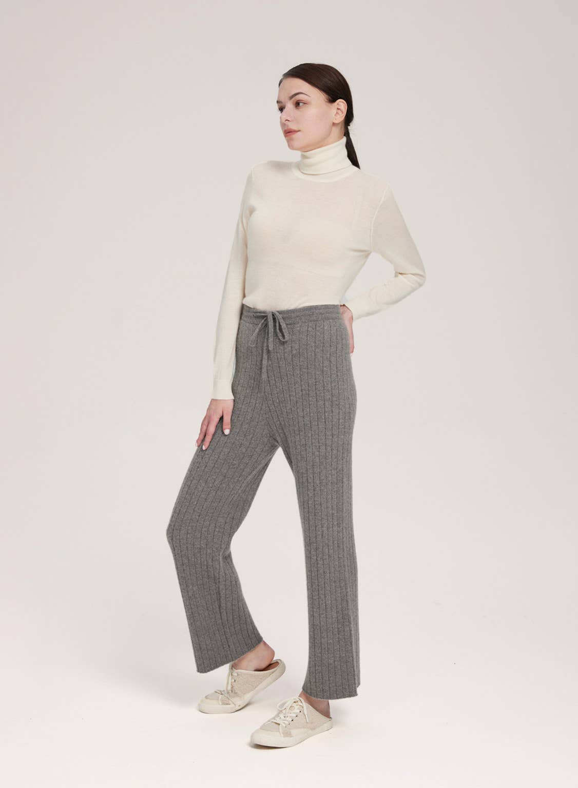 This delightful and comfortable cashmere looks so stylish with its ribbed pattern, wide-legged trouser with elastic waistband.