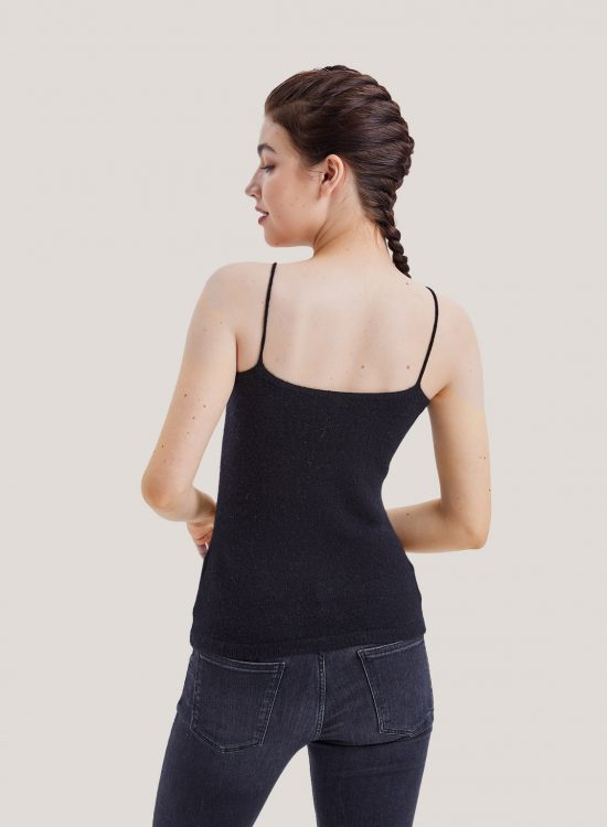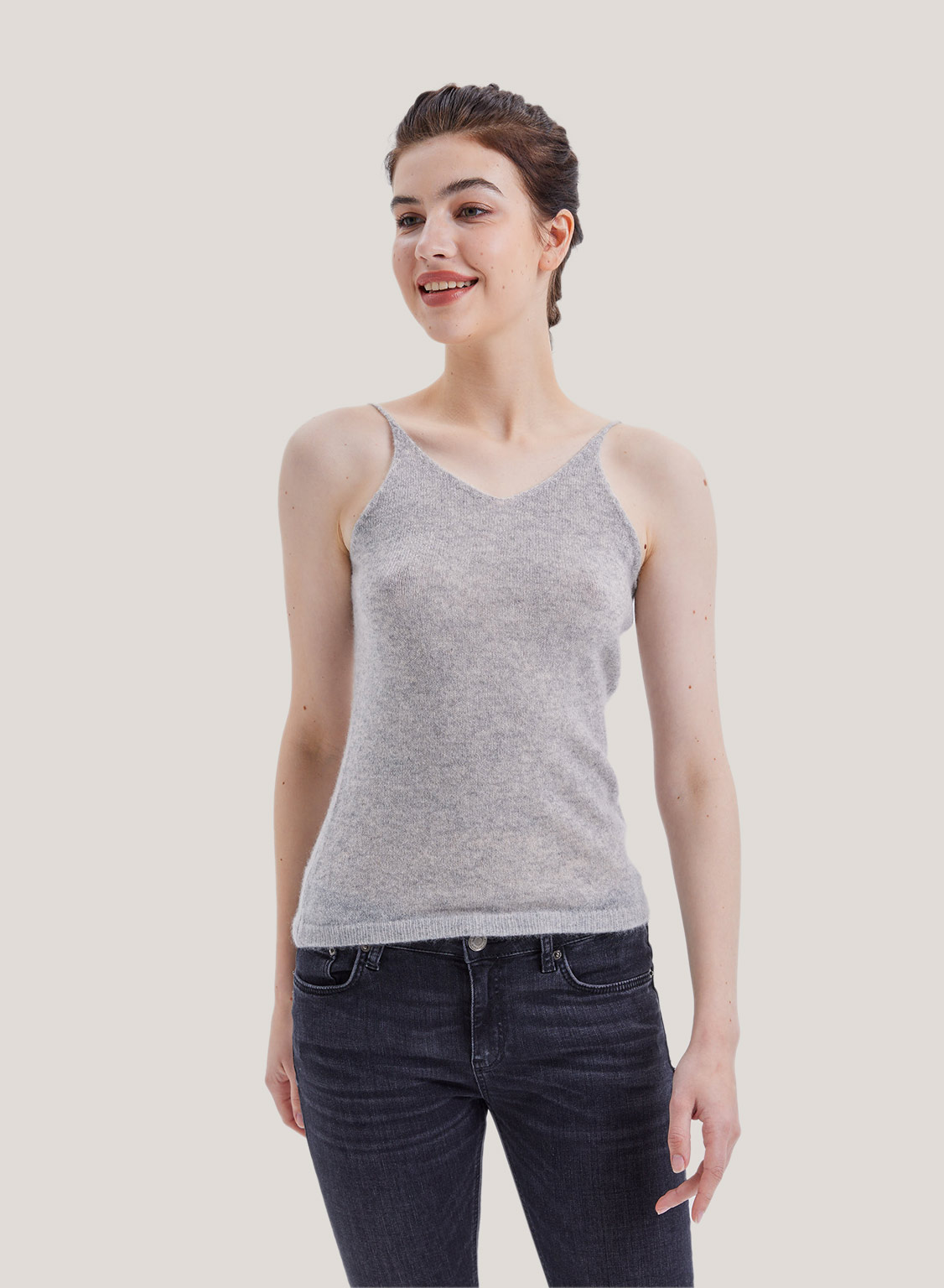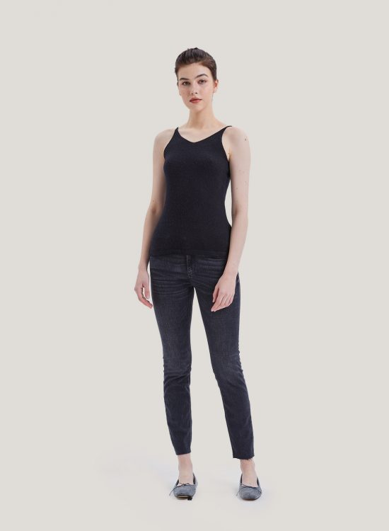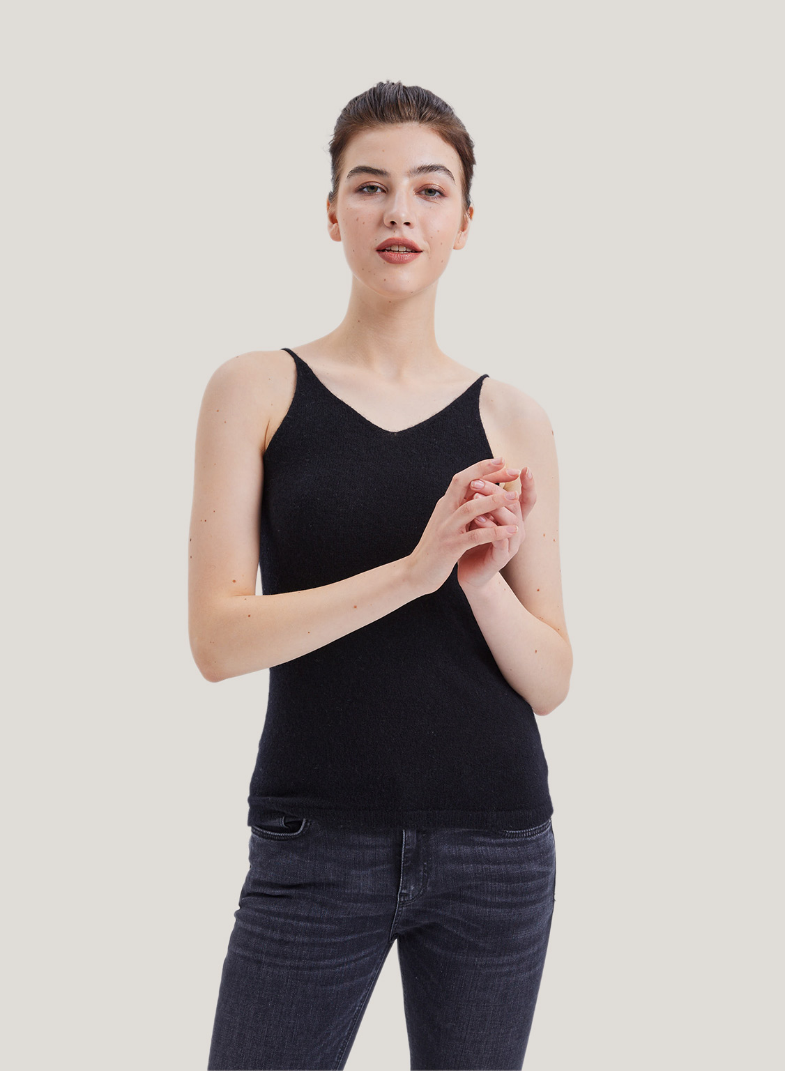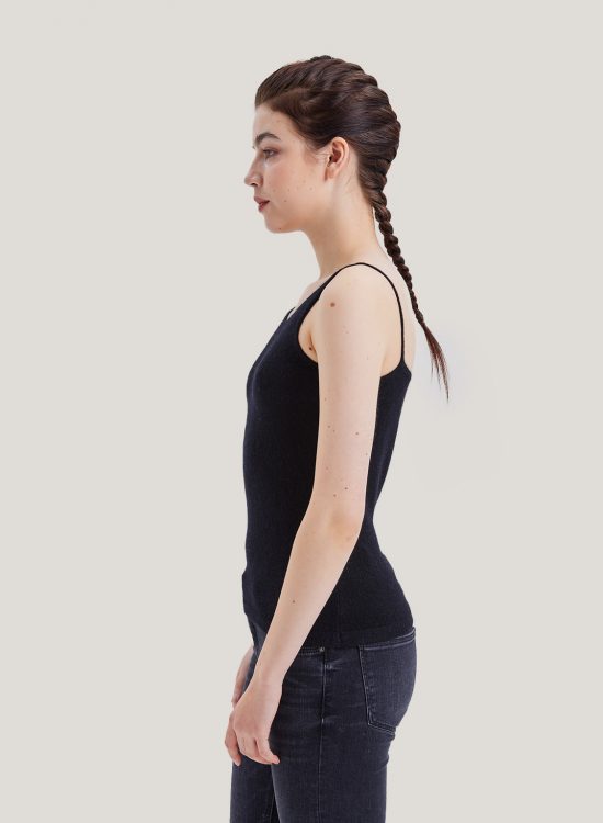 A modest yet chic top. Featuring a higher v-neckline and skinny straps, this tank top offers a timeless silhouette.