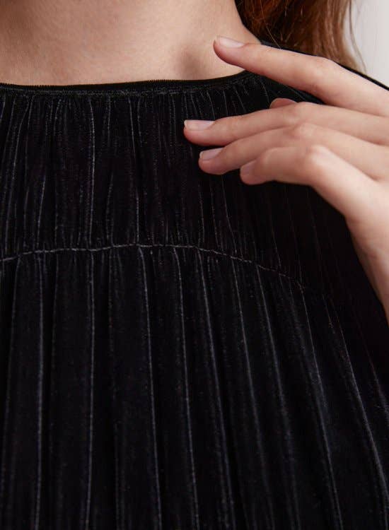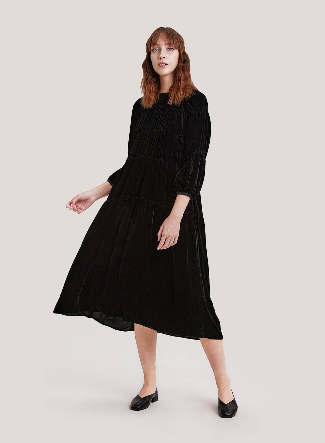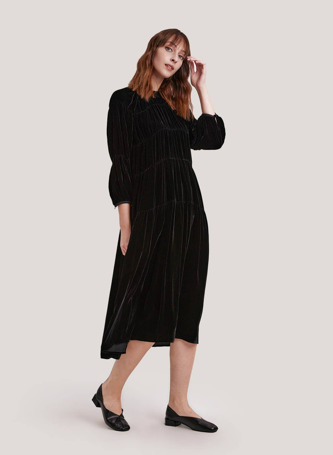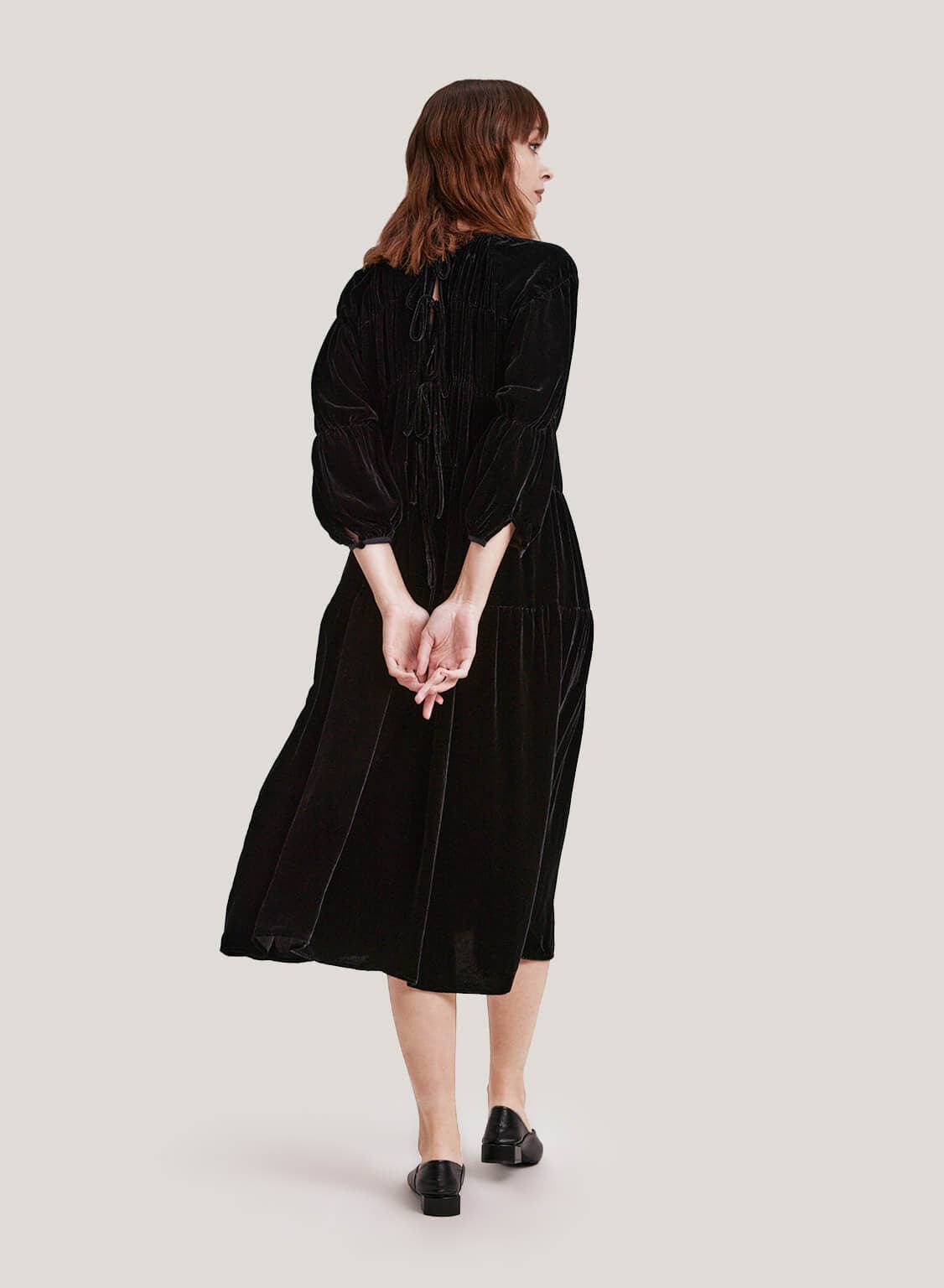 This dress is cut slightly loose in tactile silk blended velvet enhances the retro glamour feel. And wearing this swing dress is raised with a romantic look.- Normal Fit