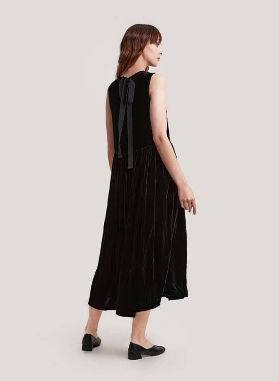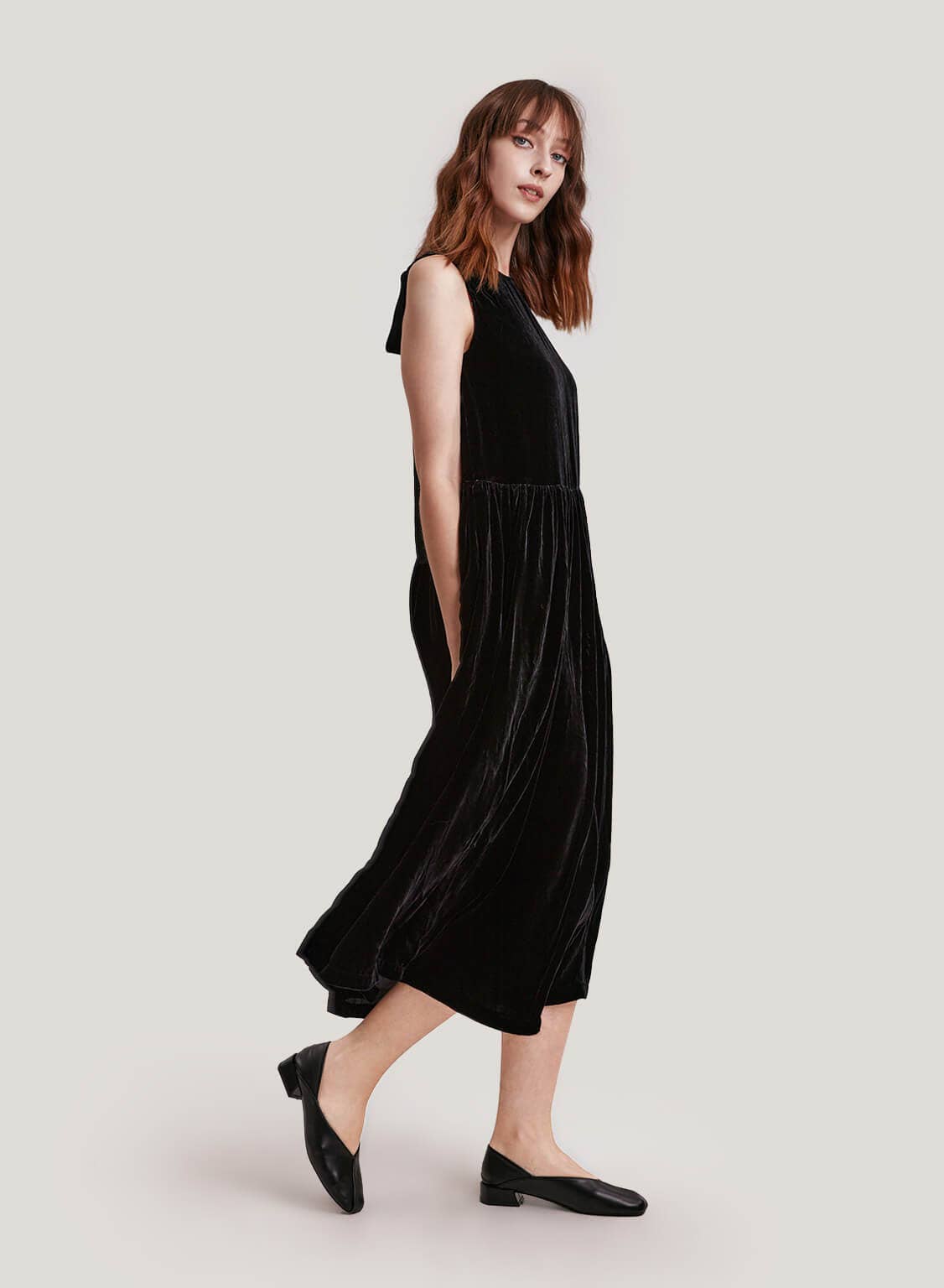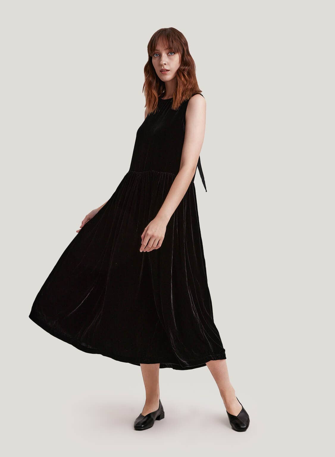 This demure sleeveless dress evokes an elegant, vintage-inspired mood. It's crafted from velvet and shaped for a roomy silhouette with a curved hem.- Normal Fit