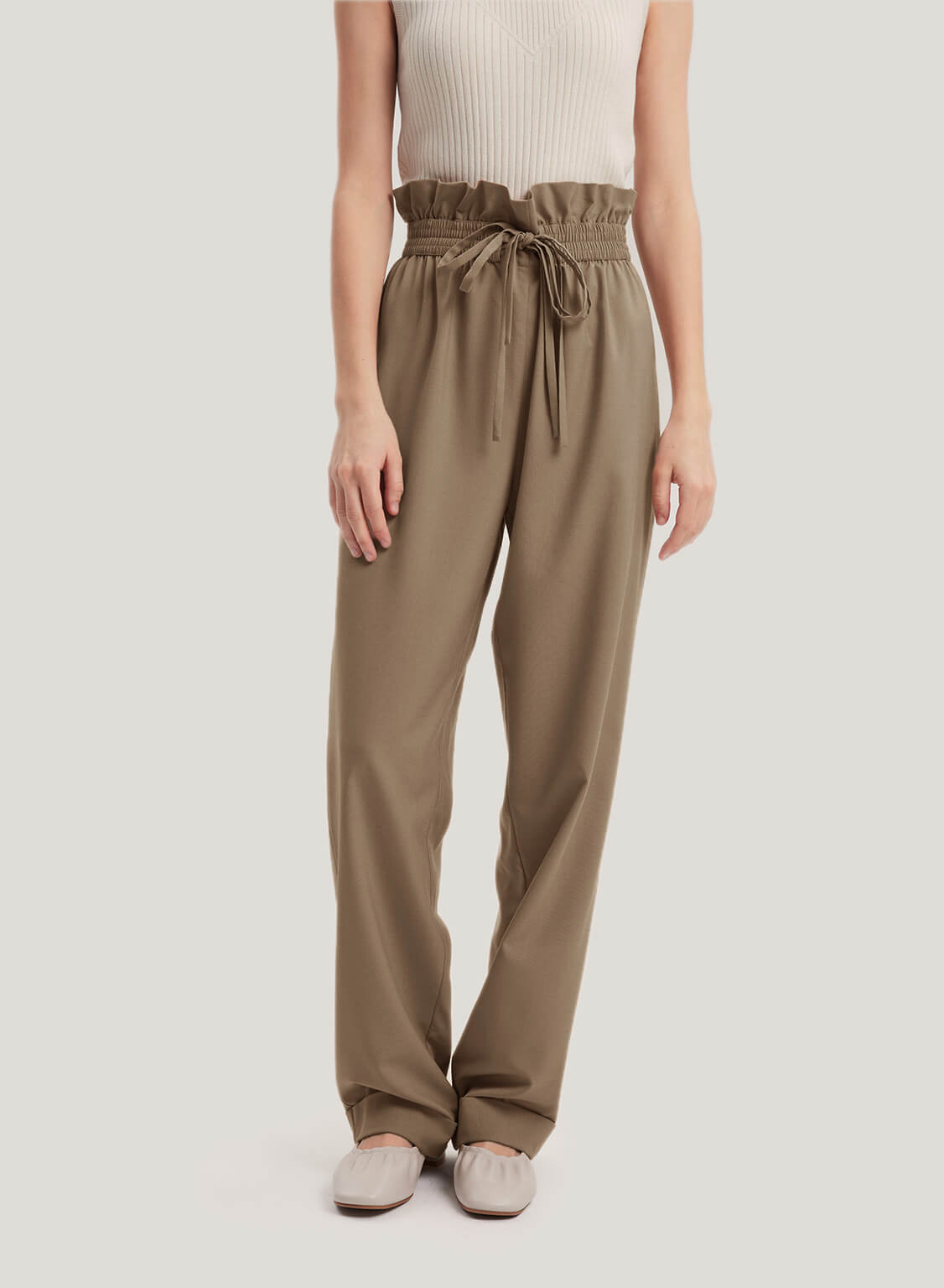 These seasonless trousers feature draped legs, creating a neat finish. They're made from stretchable wool blend fabric and have a high silhouette with straight legs. It will become the season's tailored trousers that enhance the daily versatile style.