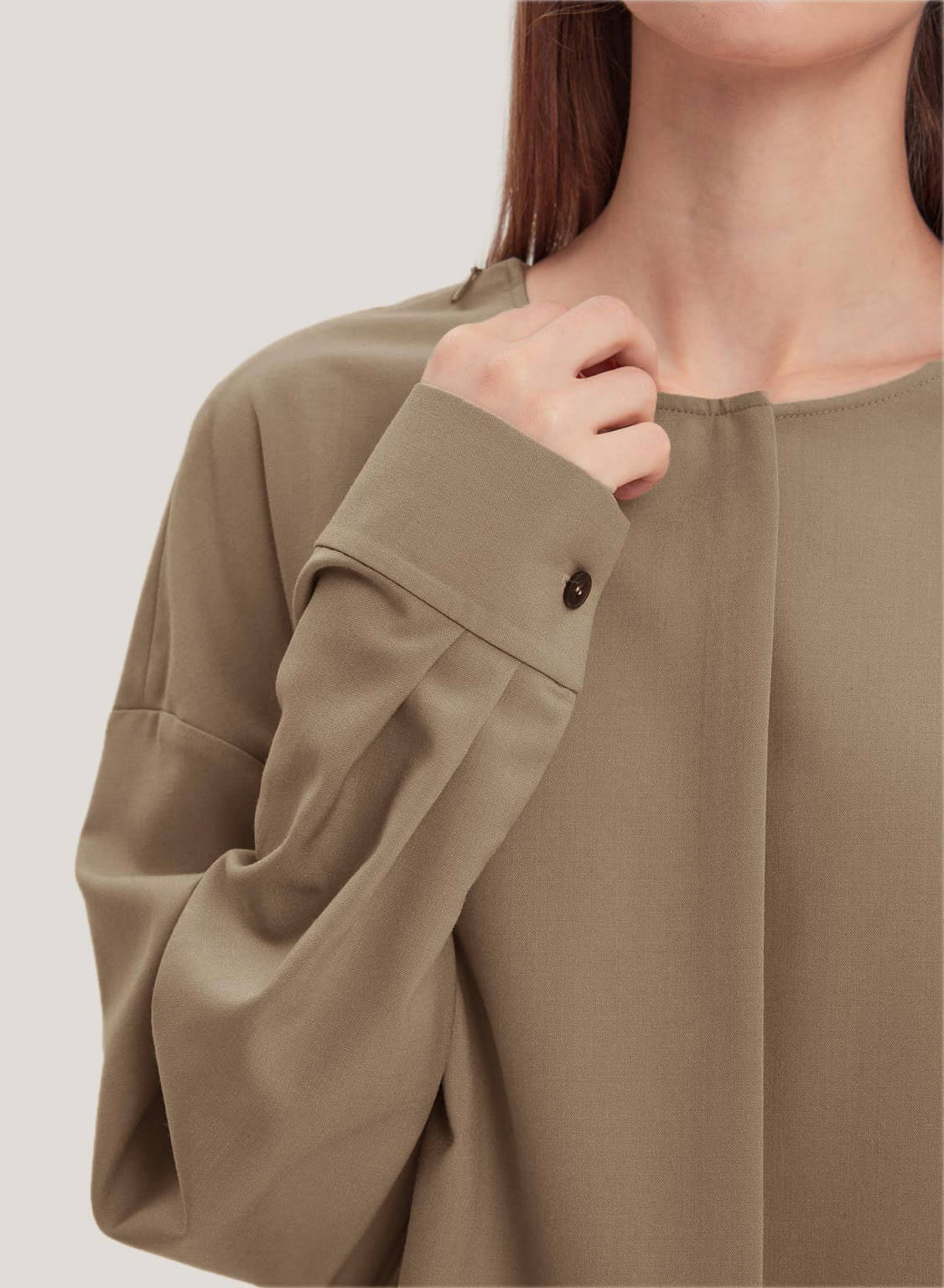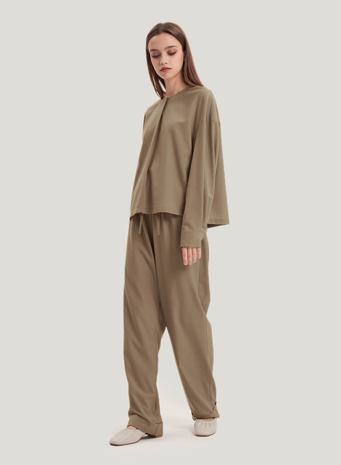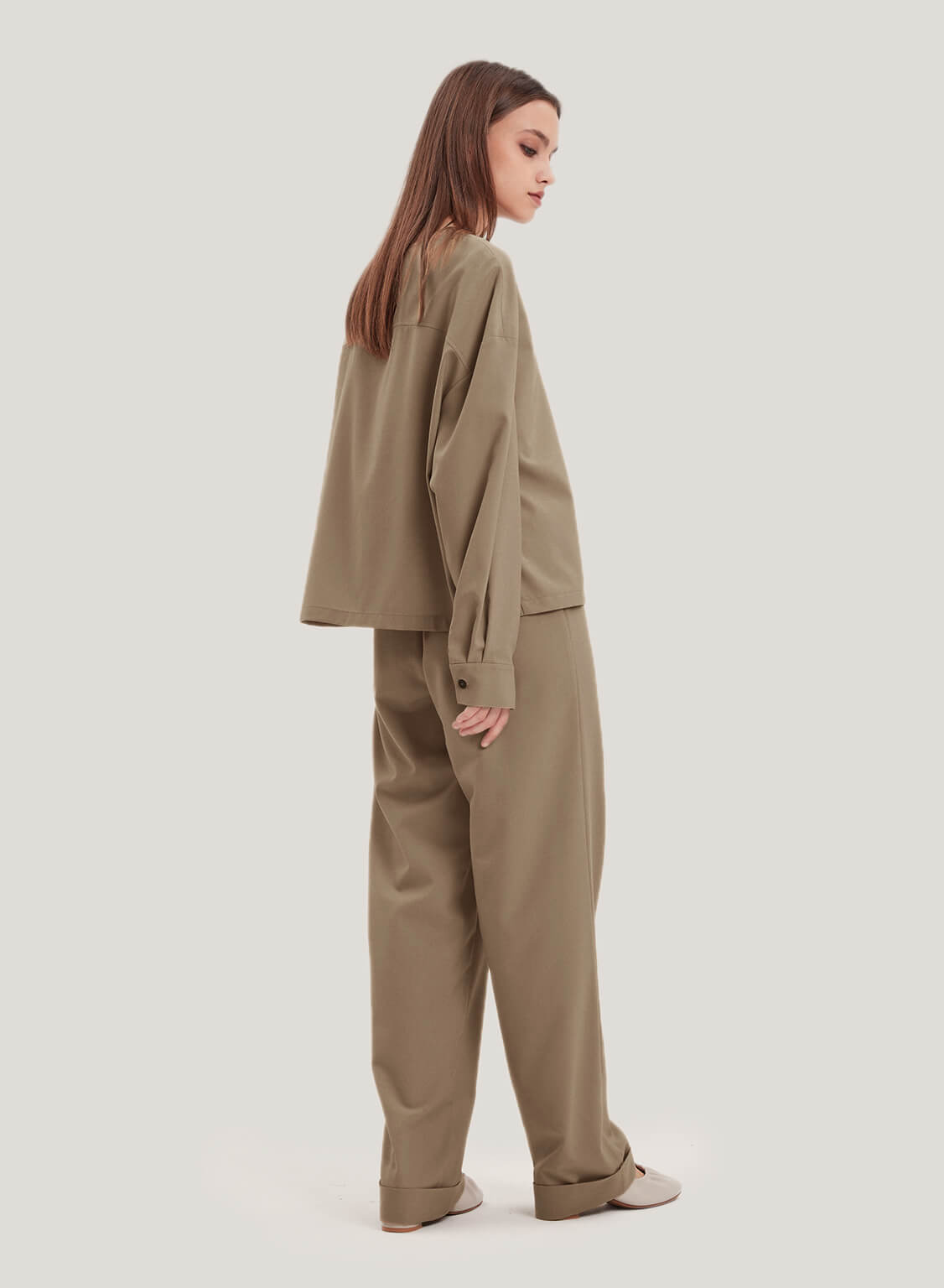 This set is crafted from a soft and smooth all-season wool-blend fabric. Invest in this high-quality set, an essential closet that surpasses trends and seasons. The blouse is gathered from neckline to hemline, creating smooth pleats that drape elegantly on the front. And the trousers feature draped legs, creating a neat finish. It will become the season's tailored trousers that enhance the daily versatile style.